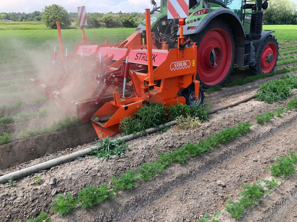 De vraag voor de hogere vrije doorgang is in de pioenrozen ontstaan. Ook in de biologische peenteelt, vooral in Duitsland, is dit een voordeel. “De doorontwikkeling betekent dat we heel lang ook door de hogere gewassen heen kunnen totdat die helemaal dicht gegroeid is”, legt Wichard Struik van Struik Holland uit.