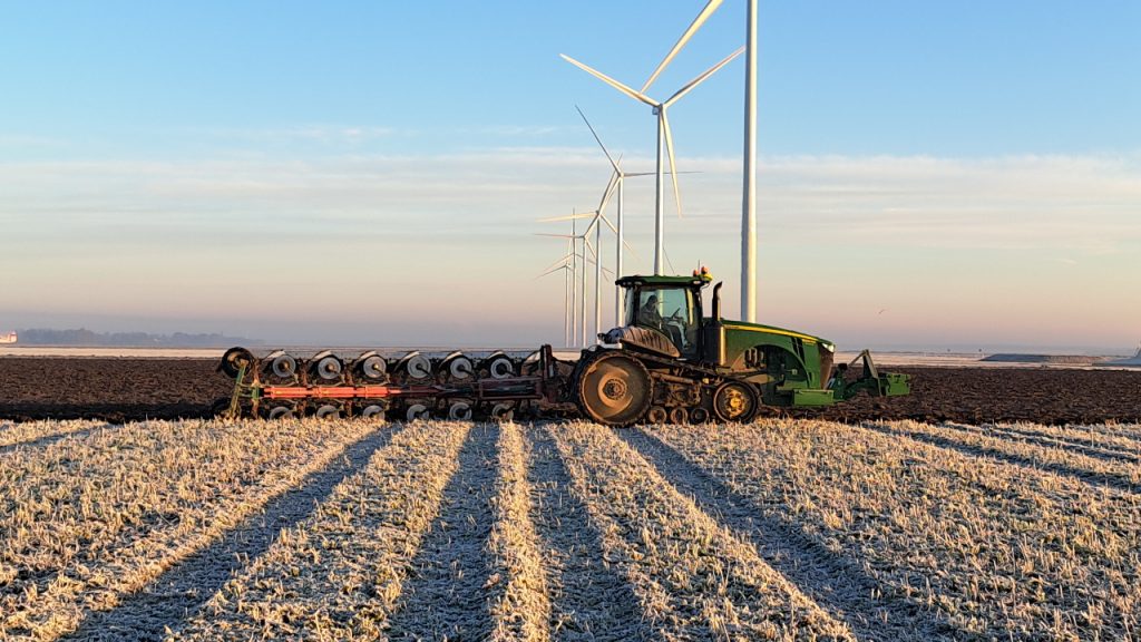 De ochtendzon schijnt over de bevroren overblijfselen van de bladrammenas, die medewerker Albert Spelde van Van Liere Landbouw uit Dronten vervolgens onderploegt. De John Deere 8335 RT met rupsuitvoering kan de bevroren grond makkelijk aan. Terwijl de vogels op zoek zijn naar iets lekkers in de dampende grond, stap ik in de warme cabine en ga het gesprek met hem aan.
