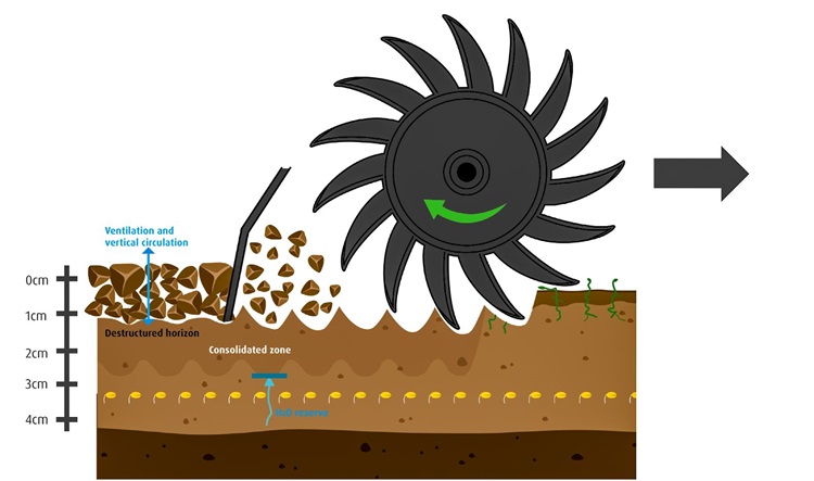 Met name op kleigrond is dit doorgaans een aandachtspunt, maar met de nattigheid van nu is het een vrij algemeen beeld, ook op andere grondsoorten. “Door heel ondiep te werken breek je de bovenste laag van de bodem open. Zo krijgen de planten meer zuurstof en wordt de capillaire werking in die laag gestopt, waardoor het dieper gelegen water beschikbaar blijft voor de zaadjes. Hierdoor wordt ook de opname van water door het gewas verbeterd en stroomt dat niet door de korstvorming af naar sloten of spuitsporen.”