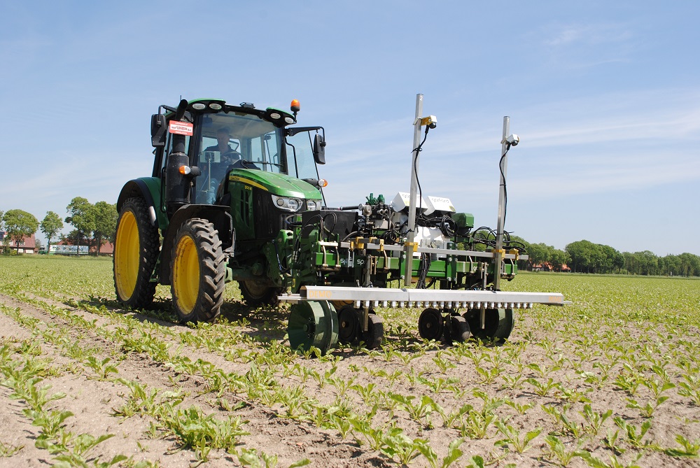 Verschillende onderzoeken van de WUR geven aan hoe moeilijk en lastig de bestrijding van aardappelopslag is. “Nog steeds is RoundUp gewoon het meest effectief. Montrel schijnt in suikerbieten een goede vervanger te zijn. De vraag is over het algemeen natuurlijk de hoelang RoundUp nog beschikbaar is, maar dat staat in principe los van de techniek.” Met de Garford is de afgelopen tijd volop getest in bieten, uien en veldbonen. “Het gaat er uiteindelijk om dat de aardappelopslag van het gewas wordt onderscheiden. Daarbij hanteren we niet plantherkenning op basis van een algoritme, waarbij enorme aantallen beelden worden geschoten van het onkruid. Wij zeggen dat de camera het onkruid buiten de geplante rijafstand van bijvoorbeeld vijftig centimeter moet herkennen.”