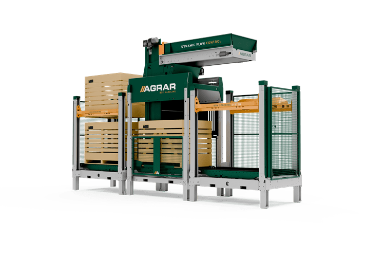 Het ontwikkelen van een geschikte techniek voor het vullen van kisten gaat immers niet over één nacht ijs. Daarvoor is kennis nodig van zowel het product als de vultechniek. De BF280 van Agrar Box Handling werkt volgens een uniek concept, Dynamic Flow Control (DFC), waarbij kisten automatisch in lagen zijn gevuld. Christiaens legt uit: “Het uiteinde van de aanvoerband is verticaal in de hoek van de kist gebracht, waarbij het product op verschillende treden van de band ligt. Met het starten van het vullen wordt het product met beleid onderin de kist geplaatst. De band schuift vervolgens opzij, totdat de bodem van de kist volledig gevuld is. Vervolgens schuift de band iets omhoog en komt de tweede laag erop. Dit wordt nog een keer herhaald, totdat de kist volledig gevuld is.”