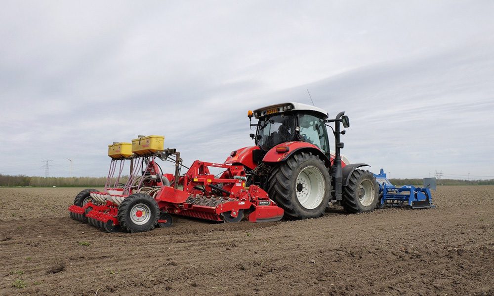 Mts. Van Stee is half april druk met het uitzaaien en secuur aanleggen van stroken met acht verschillende rassen voor de zaadvermeerdering. Vlak voor een buitje gaan de rassen de grond in. De Steyr 4130 Profi CVT vormt een fraaie combinatie met VSS-frontbereider, Kverneland M-serie rotorkopeg en daarachter de 11-rijige Kverneland Miniair Nova-zaaimachine. De machine staat voor een nauwkeurige zaadafleg en een constante zaaidiepte, terwijl de opklapbare elementen extra flexibiliteit geven bij bedden van 1,5 meter en bij spuitsporen. Ook de granulaataansluiting wordt benut.